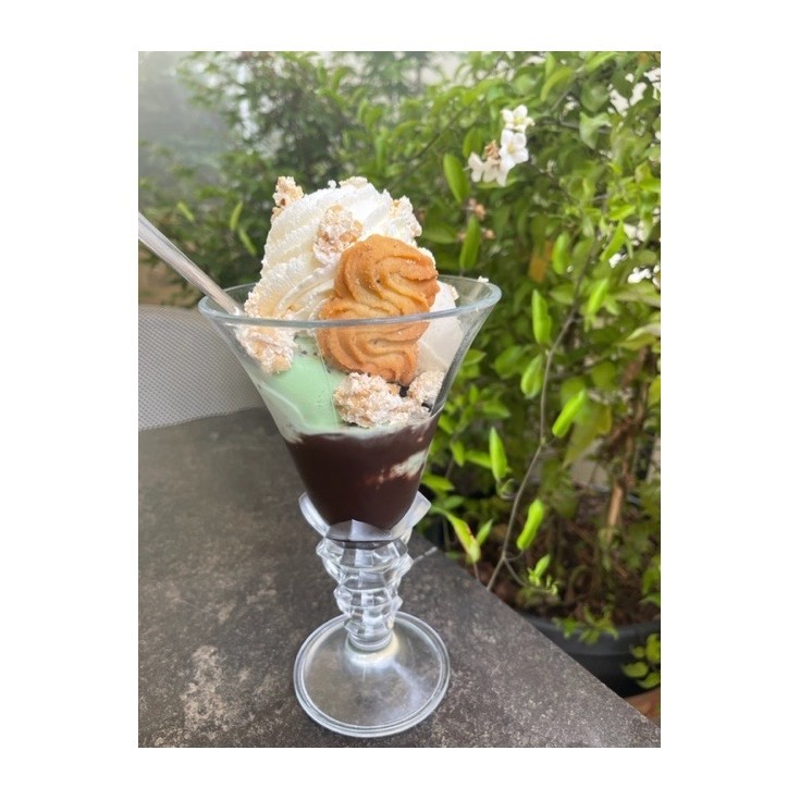 1 boule de glace vanille, 2 boules de glace menthe-chocolat, sauce chocolat noir maison,Chantilly maison